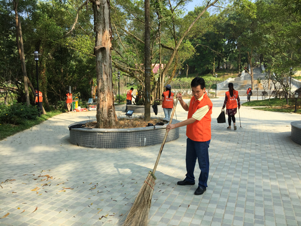当日上午,党员义工们穿着义工服,拿着扫把,垃圾钳和垃圾袋,从改造之后的金山公园新设置的入口平台开始,绕着山边向着人工湖平台区域开展清洁。有些义工负责清扫地面,有些义工负责收拾树下石礅扫不到的垃圾,有些义工拿着钳到达一些小山坡、排水渠、花圃等地方,捡拾塑料袋、饮料罐、果皮残核等破坏生态的垃圾。两小时后,几公里长的山道、平台、山坡便拾掇得干干净净。服务期间,一路上都得到许多市民的交口称赞:“党员义工好野!”