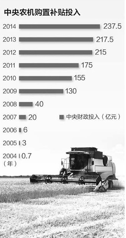 2004年11月1日农业机械化促进法实施以来,我国农业机械化迎来跨越式发展的“黄金十年”。据统计,2004—2014年中央财政共安排农机购置补贴资金1200亿元,补贴购置各类农机具超过3500万台(套)。全国农作物耕种收综合机械化水平由2003年的33%提高到2014年的61%,为保障我国粮食安全、加快农业现代化提供了坚实的支撑。