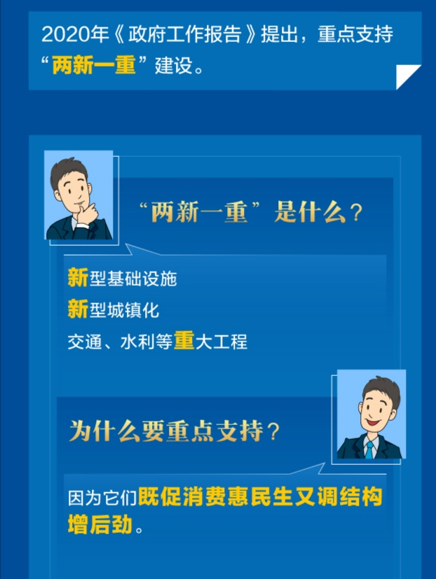 (图片来源:中国政府网) 从报告内容来看,无论是加强新型基础设施建设和加强新型城镇化建设“两新”,还是加强重大工程建设“一重”,都与交通运输行业密切相关。 结合国家发展改革委提请大会审议的《关于2019年国民经济和社会发展计划执行情况和2020年国民经济和社会发展计划草案的报告》,我们可以更详细地了解“两新一重”涉及交通运输的具体任务。 “两新”方面 加强国家物流枢纽、国家骨干冷链物流基地和商品流通网络建设,推动冷链物流、智慧物流、国际物流、供应链发展。推进电子商务与快递物流协同发展。 扩大电商、快递进农村覆盖面,畅通工业品下乡、农产品进城渠道。 积极扩大汽车消费,允许进口尾气排放实测结果达到国六标准的平行进口汽车。对京津冀等重点地区淘汰国三及以下排放标准柴油货车给予适当奖补。加大汽车、绿色智能家电等消费金融支持。 进一步支持依托互联网的外卖配送、网约车等新业态。 有序放宽低空空域限制,加快通用航空网络建设,推动通用航空发展。 加快无人配送等新兴产业发展。支持新能源汽车、储能产业发展,推动智能汽车创新发展战略实施。 加快推进县城新型城镇化建设,弥补市政公用、公共服务等领域短板弱项。 做好城镇老旧小区改造,重点改造提升小区水电气路信等配套便民设施,有条件的配建停车设施。推动城市更新,加大城市停车场和充电设施等建设力度。 “一重”方面 实施好“十三五”规划165项重大工程项目和国家重大区域战略重大项目。 加大沿江高铁、沿海高铁项目建设力度。积极推动川藏铁路开工,加快重点城市群、都市圈城际和市域(郊)铁路规划建设。 加快推进枢纽机场新建、迁建和改扩建项目建设,有序推进支线机场和通用机场建设。 加快推进国家高速公路、普通国省干线、农村公路和内河水运等项目建设。 推动长江中游、中原、关中平原、山东半岛等城市群重点领域发展,启动一批重点都市圈交通设施互联互通项目。 资金哪里来? 安排中央预算内投资6000亿元,比上年增加224亿元。全年安排地方政府专项债券3.75万亿元,比上年增加1.6万亿元。按照“资金跟着项目走”要求,安排好地方政府专项债券项目,集中支持有一定收益的基础设施和公共服务项目。 继续加大金融支持,发挥政府资金的导向作用,规范创新政府和社会资本合作(PPP)模式,支持民间资本参与补短板和新型基础设施建设。 稳妥推进基础设施领域不动产投资信托基金(REITs)试点,充分调动包括民间投资在内的各类社会资本积极性,盘活存量资产。