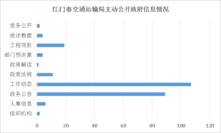 2018年,江门市交通运输局始终贯彻“以公开为常态,不公开为例外”的要求,全面加强主动公开工作。2018年主动公开组织机构信息2条,人事信息6条,政务公告89条,工作动态107条,政策法规11条,政策解读1条,部门预决算4条,工程项目管理信息19条,统计数据4条,党务公开2条。