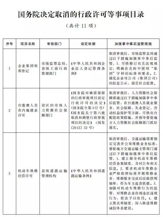 经研究论证,国务院决定取消11项行政许可等事项,现予公布。另有6项依据有关法律设定的行政许可事项,国务院将依照法定程序提请全国人民代表大会常务委员会修订相关法律规定。对取消的行政许可等事项,相关部门要制定完善事中事后监管细则,自本决定发布之日起20个工作日内按规定向社会公布,并加强宣传解读、确保落实到位。