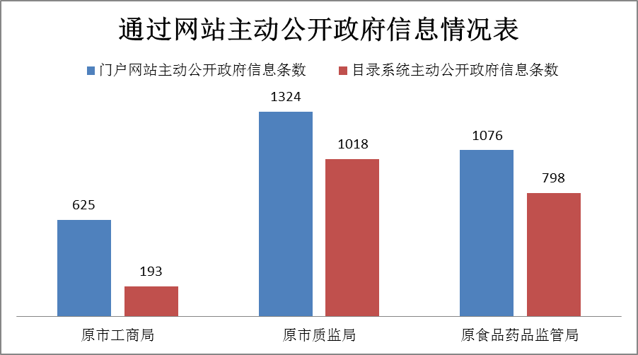 (一)通过网站主动公开政府信息情况:2018年,原市工商局共计在门户网站主动公开政府信息625条,在江门市政府信息公开目录系统主动公开政府信息193条;原市质监局在门户网站公开政府信息1324条,在目录系统公开政府信息1018条;原市食品药品监管局在门户网站公开政府信息1076条,在目录系统公开政府信息798条。主要包含组织机构类信息、行政执法类信息、办事指南类信息、工作动态类信息、财政预决算类信息、产品质量检测结果、单位文件等工作信息。