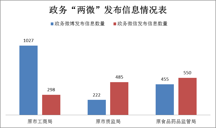 (三)通过政务“两微”主动公开政府信息情况:2018年,原市工商局、原市质监局、原市食品药品监管局分别发布微博信息1027条、222条、455条,分别发布微信信息298条、485条、550条,有效公开政府信息,及时接收和回复群众咨询,实现政企政民良好互动。