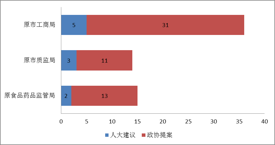 2018年,原市工商局共承办人大建议、政协提案36件,其中主办6件,会办30件,人大建议5件、政协提案31件;原市质监局共承办人大建议、政协提案14件,其中主办2件,会办12件,人大建议3件,政协提案11件;原市食品药品监管局共承办人大建议、政协提案15件,其中主办6件,会办9件,人大建议2件,政协提案13件。我局对承办的建议提案高度重视,及早安排,办理答复率达100%,并均在规定时限内办结。