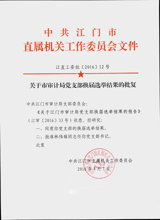 关于江门市审计局党支部换届选举结果的报告