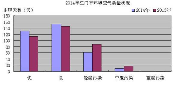 2014年江门市区空气质量达标天数284天,同比增加25天,达标天数比例为80.2%,比2013年上升9.2个百分点,其中优131天、良153天、轻度污染61天、中度污染9天,未出现重度及严重污染天气。