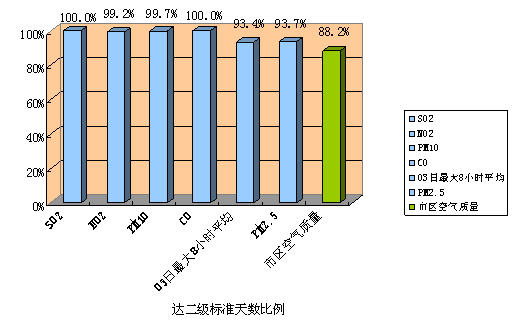 2015年,江门市二氧化硫平均浓度为16微克/立方米(年均值二级标准为60微克/立方米),较去年下降33.3%;二氧化氮平均浓度为31微克/立方米(年均值二级标准为40微克/立方米),较去年下降3.1%;可吸入颗粒物(PM10)平均浓度为50微克/立方米(年均值二级标准为70微克/立方米),较去年同期下降21.9%;细颗粒物(PM2.5)平均浓度为34微克/立方米(年均值二级标准为35微克/立方米),较去年同期下降22.7%;臭氧日均浓度(最大8小时均值第90百分位数)为146微克/立方米,较去年上升1.4%;一氧化碳日均浓度(第95百分位数浓度)为1.5毫克/立方米,较去年下降25.0%。