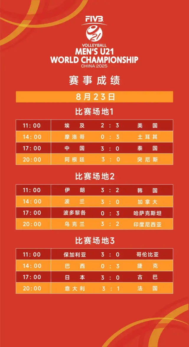2025年8月23日,恰逢周六,2025年世界U21男子排球锦标赛迎来第三个比赛日。12场精彩绝伦的排球赛在广东江门体育中心体育馆轮番上演,吸引了大批观众到场观战,现场氛围热烈。中国U21男排表现强势,直落三局击败泰国队,豪取三连胜。三局比分分别为25-18、25-17和25-19。