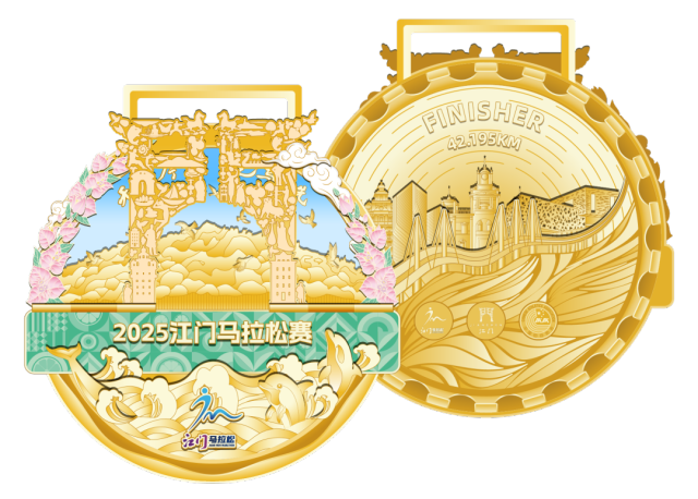 今年的奖牌是可触摸的 “江门百科”,正面以繁体字 “门” 为造型立牌,如同打开侨都的文化之门 —— 市花三角梅缠绕祥云勾勒出半圆轮廓,花瓣上的纹路细品竟藏着五邑非遗的图样;背景里,巴金笔下 “鸟的天堂” 生机盎然,数万鹭鸟在榕林间振翅的盛景跃然其上,中间嵌入的新会陈皮柑橘插画,更让奖牌染上了侨乡物产的温润色泽。翻转奖牌,另一面则是城市的 “奋进答卷”:黄茅海大桥的钢构线条尽显工程之美,周围的现代建筑群仿佛正在生长,上方 “FINISHER 42.195km” 的字样,将跑者的个人荣耀与城市的发展印记牢牢镌刻在一起。