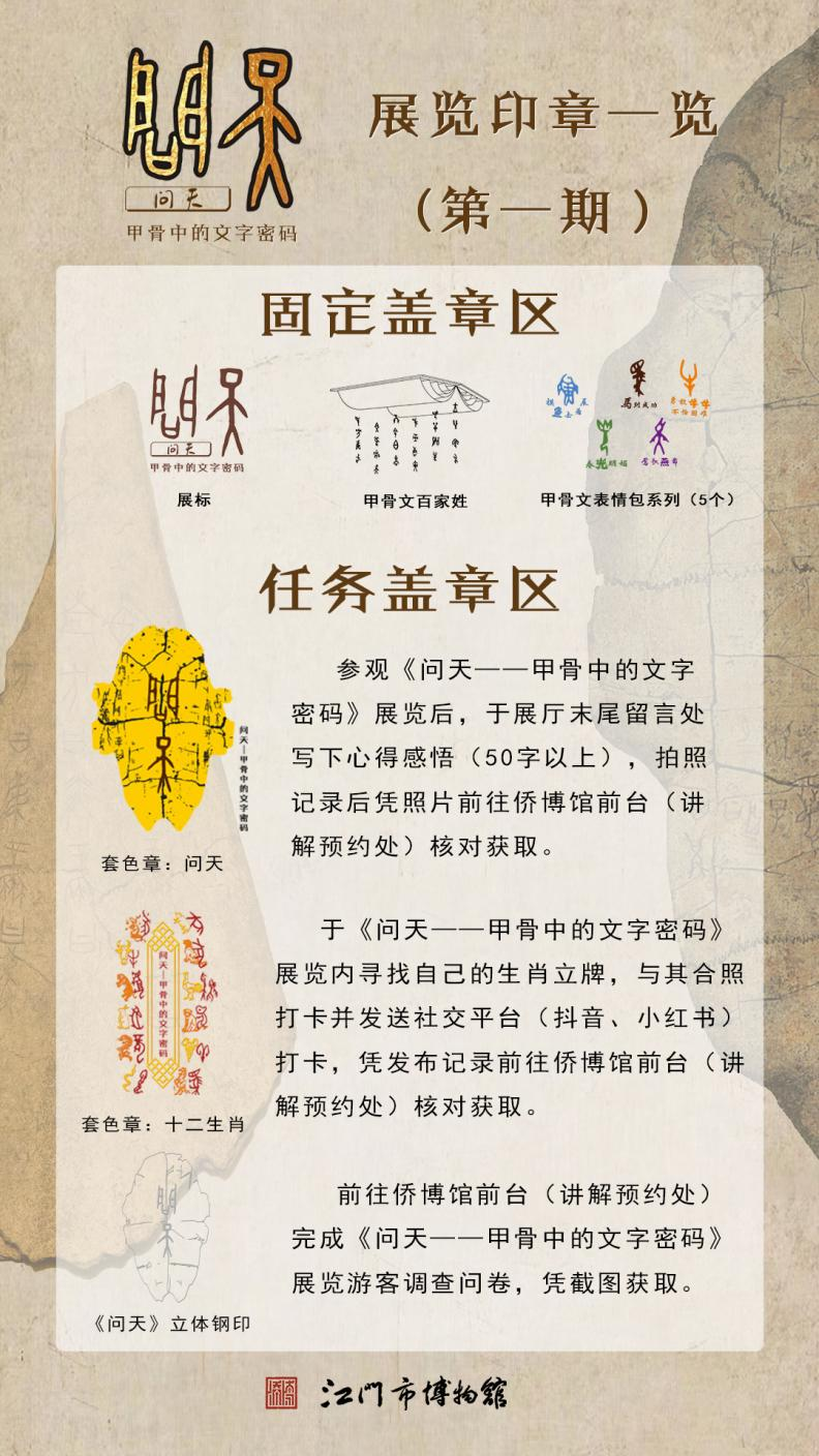 “问天”系列印章(第一期)已上线!本次展览印章将古文新用,固定盖章区将推出甲骨文表情包系列印章,当甲骨文与现代表情包相结合,会碰撞出怎样的火花?同时,参观结束后,在展厅末尾留下你的观展留言,可获得《问天》甲骨套色章哦!展厅内还设有甲骨文十二生肖大立牌,与立牌合影并在社交媒体打卡,即可获得甲骨文十二生肖系列套色章!