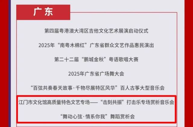 近日,2025年第四季度国家公共文化云网络直录播入选名单公布,江门市文化馆2项活动——江门市文化馆高质量特色文艺专场“击刻共振”青少年打击乐专场赏析音乐会、“舞动心弦·情系你我”舞蹈赏析会成功入选!