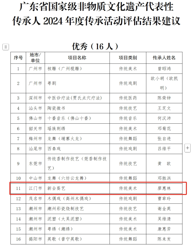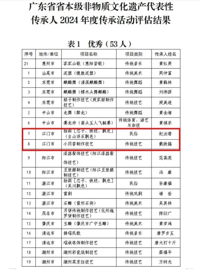 近日,广东省文化和旅游厅公布了广东省国家级及省本级非物质文化遗产代表性传承人2024年度传承活动评估结果。