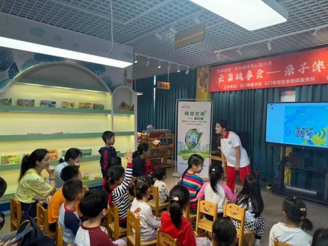 志愿者老师一边讲述,一边结合画面引导孩子们思考:“小老鼠因为玩手机,错过了什么呀?”“它没有和朋友一起玩!”“它没吃好吃的饼干!” 孩子们纷纷举手回答,眼神中满是认真。 整个故事分享环节,在轻松幽默的氛围中,让孩子们明白了过度使用手机的危害,也让家长们对亲子间的数字生活管理有了新的思考。