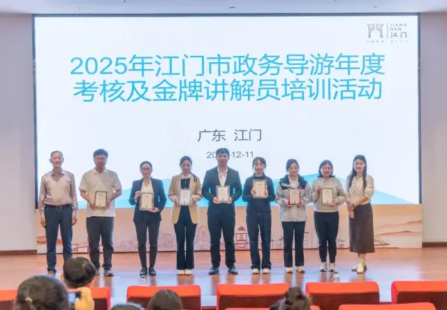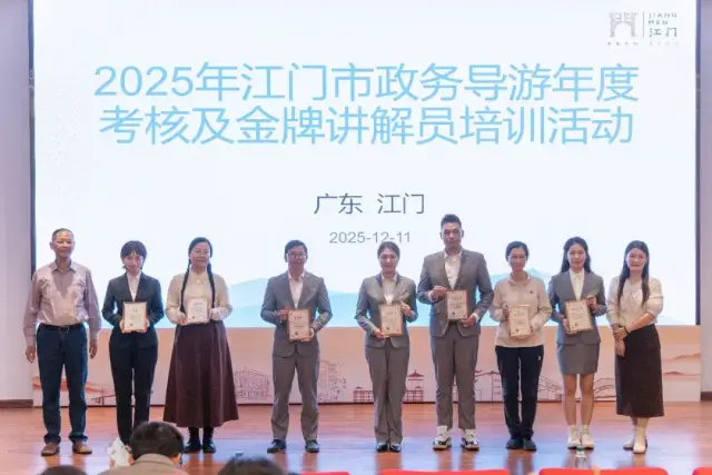 值得一提的是,在证书颁发仪式上,一批表现优异的讲解员被授予江门市2024至2025年度“金牌讲解员”称号;同时,新一批政务导游员获颁2026年度聘书,星级政务导游员名单也得以更新。这份荣誉既是对过往成绩的肯定,更是对未来责任的赋予。