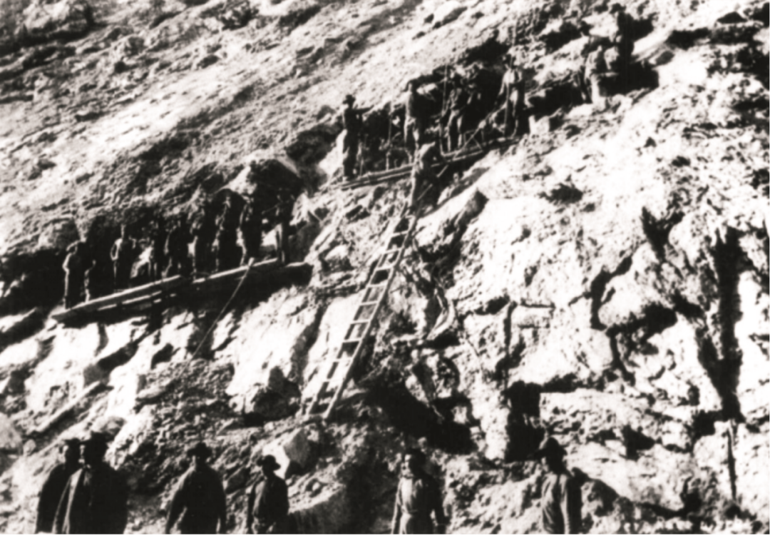 华工在危险的悬崖上施工