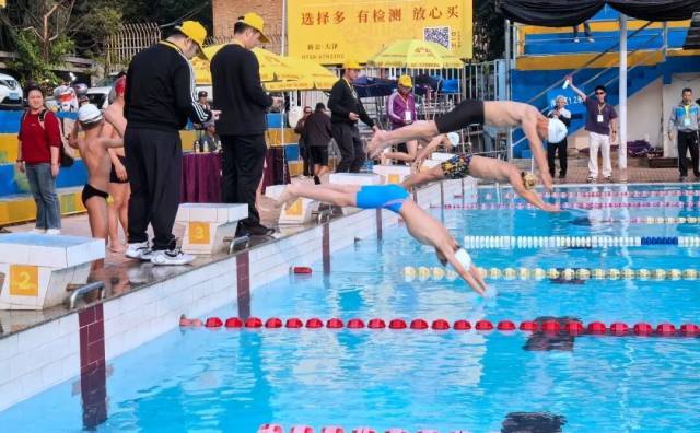 随着发令枪响,选手们纵身跃入水中,以矫健身姿劈波斩浪,在泳池间展开激烈角逐。赛场周边,亲友团、观众的呐喊助威声此起彼伏。