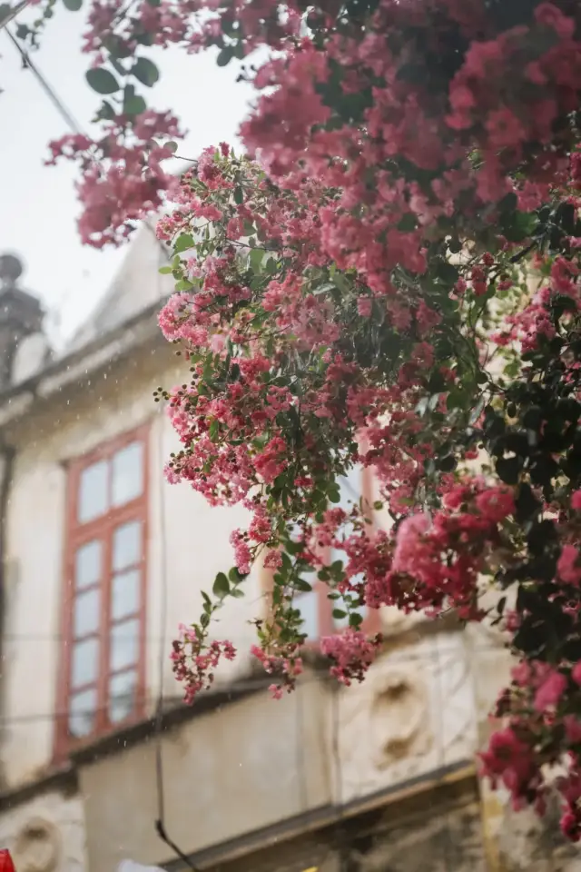 路边的花和墙角的树,在雨水的冲洗下显得更加艳丽,五彩斑斓的颜色组合在一起,造就了古镇的盎然生机。且到处洋溢着一股青草香,呼吸一口让人心情愉悦不已。