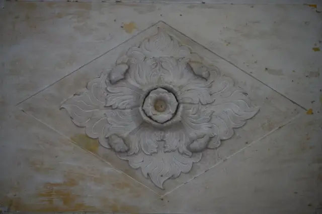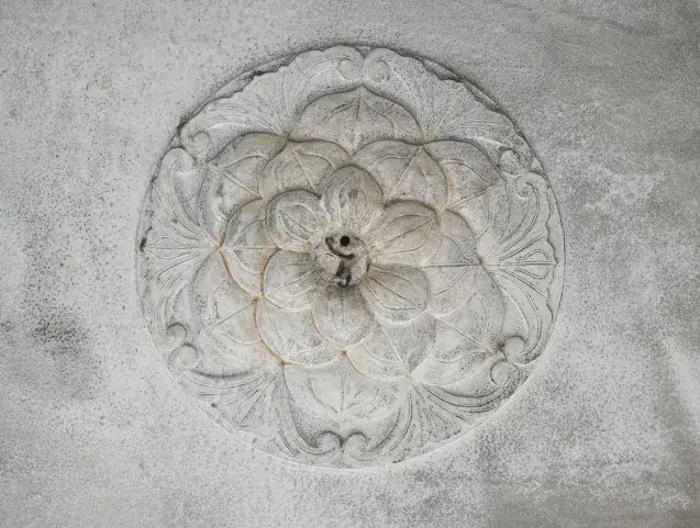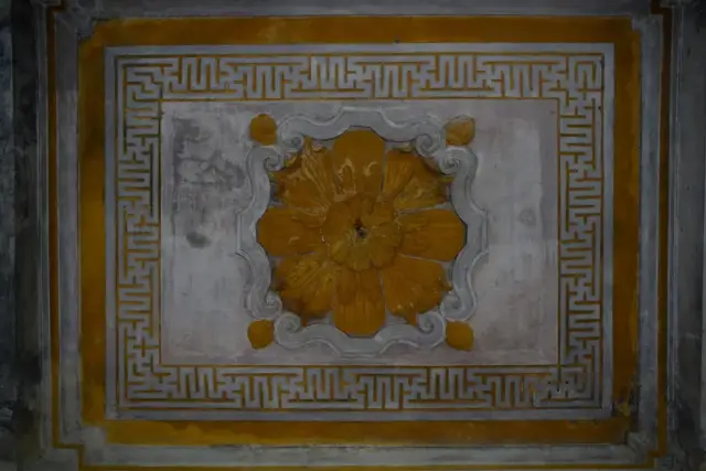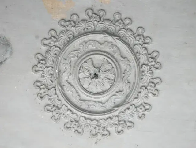这种位于骑楼天花板的装饰称之为“灯影花”,通常采用壁画与灰雕相结合的方法制作,它们形状各异,图案也是各显特色,花中间一般都有留有洞口,用作挂灯使用。