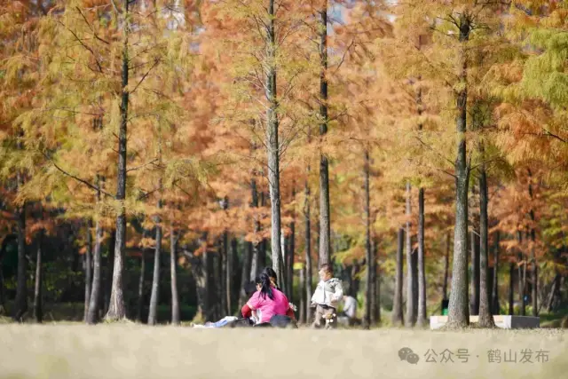 成片的杉树的树叶逐渐由绿转黄再转红,