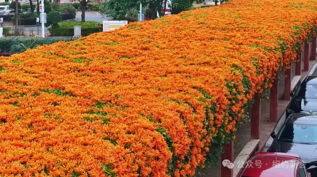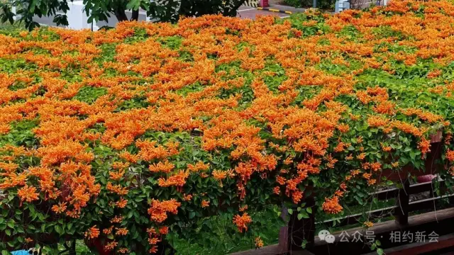 如同倾斜而下的橙红色瀑布与水乡的鱼塘古榕、青砖古建