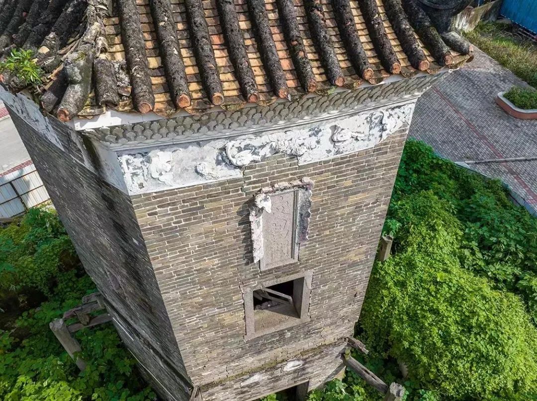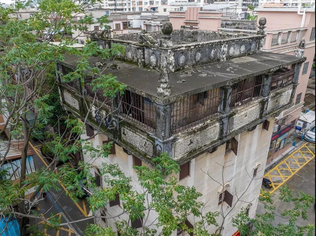 楼顶为平屋顶,南面设灰塑山花。该楼是会城城区少数仅存的碉楼之一,是新会典型的碉楼,保存较好。