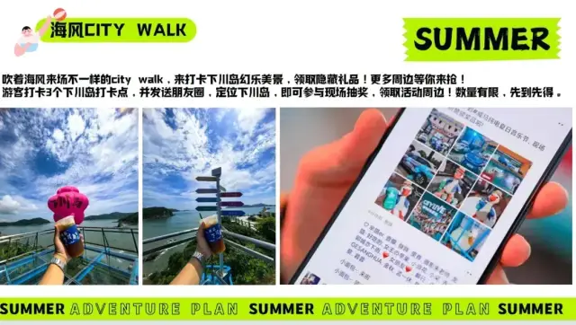 活动内容:游客打卡任意3个指定打卡点,并定位下川岛,发送朋友圈,即可参与线下抽奖,领取活动周边。(数量有限,先到先得)