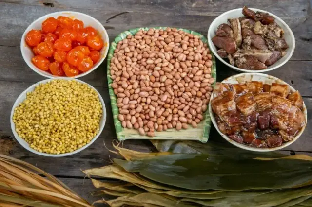 地道的台山粽离不开红蓝(榄)叶,将红蓝(榄)叶洗净剁碎后与五花肉混合,可解油腻。大米与红豆大火炒制,使米粒增香,口感劲道。