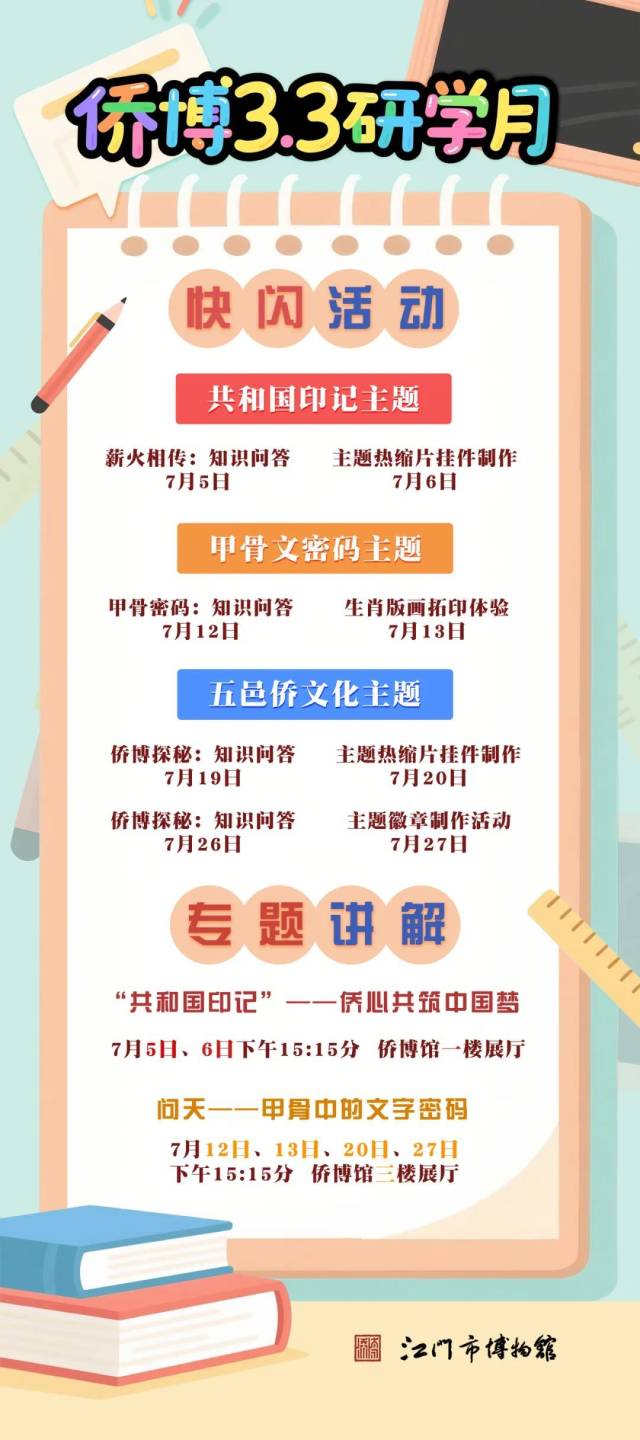 炎炎夏日,想要玩得开心又收获满满?侨博3.3研学主题月来了!这里不仅有烧脑又有趣的主题知识问答,激发探索欲;更有创意无限的手工制作课堂,锻炼动手能力,把博物馆记忆亲手创造出来;还有专业生动的专题讲解,深入解读文物背后的奥秘。知识、趣味、动手、动脑,一站式体验!