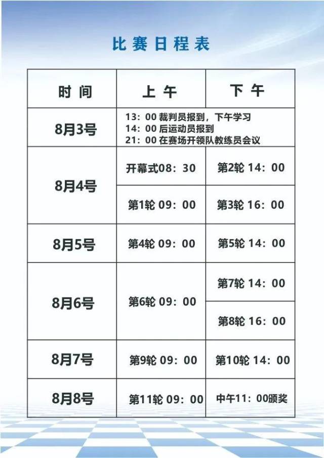 本次比赛吸引来自潮州、汕头、广州、佛山、中山等广东省各地象棋爱好者前来参赛。参赛选手们于8月3日报到入住,8月4日早上开幕式后正式开始围棋比赛,至8日上午共进行11轮比赛,8月8日中午11点举行颁奖仪式。