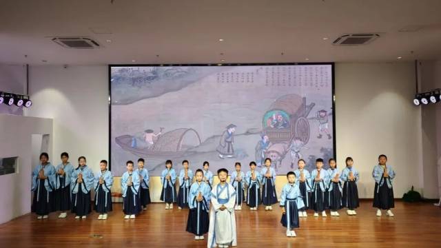 各馆经典诵读班的学员们,身着汉服、手持竹简,以稚嫩的童声,将暑期以来所学的《论语》和五邑先贤诗歌名篇,用吟诵、情景剧、粤语诵读等多元形式,为我们呈现了一场精彩的文化盛宴。一个半小时的沉浸式展演,为第二期五邑公共图书馆经典诵读班画上了圆满的句号。
