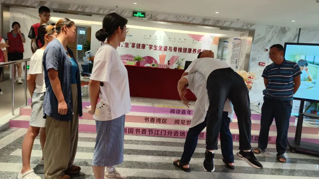 为了让大家将所学的知识转化为实际行动,周老师化身“教练”,带领读者们一起动起来。他现场教授了一些简单易学的护脊健脑小妙招,如颈部拉伸、肩部放松、腰部扭转等。这些小妙招不需要任何器械,随时随地都可以进行,非常适合学生们在课间或休息时间练习。在周老师的带领下,大家纷纷起身,跟着他的动作认真练习,现场气氛热烈,充满了活力和欢声笑语。
