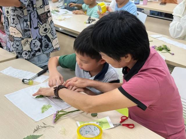 植物拓染课程中,孩子们运用天然植物材料,通过手工敲打等方式完成创作,在感受自然之美的同时,传承了传统工艺技巧,作品中蕴含的自然气息与文化韵味,成为传统文化传承的生动载体。