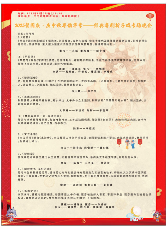 演出场次精彩丰富,门票数量有限,先到先得,欢迎各位观众朋友届时前往江门市粤剧传习所(东湖影剧院),共度一个充满粤韵风情的国庆、中秋佳节!