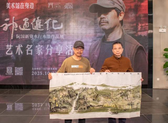 阮国新先生还特意水墨创作《春风又绿江南岸》捐赠给江门市美术馆,希望以此为侨乡文化事业添砖加瓦。江门市美术馆馆长王畅怀接收作品,并向阮国新先生表达诚挚感谢,强调这幅作品将成为美术馆藏品的重要补充,未来也会通过更多展示与传播,让这份艺术心意惠及更多市民。