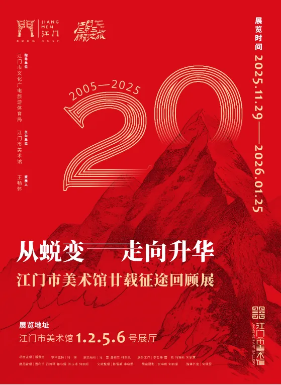 为广泛传播美术馆的文化价值,激发公众对艺术的热爱,促进文化交流,展现江门的艺术魅力,为城市文化发展注入新的活力,由江门市文化广电旅游体育局指导,江门市美术馆主办的建馆二十周年特别展览“从蜕变走向升华——江门市美术馆廿载征途回顾展”于11月29日在江门市美术馆开展。展览系统回顾了美术馆自2005年成立以来,从无到有、从探索到成熟的完整历程,通过大量珍贵的文献、作品与影像资料,向公众讲述一段属于江门的艺术成长故事。