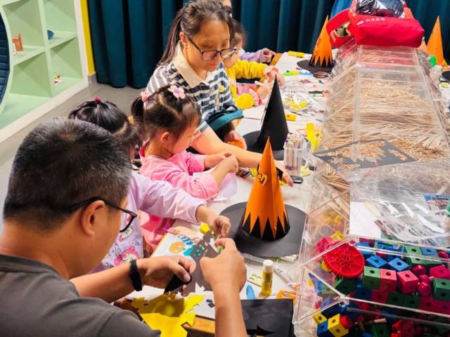 故事结束后,备受期待的延伸手工环节——“万圣节帽子制作” 正式开启。在文化志愿者老师的引导下,亲子家庭将绘本主题与创意表达深度融合,家长与孩子一同回顾《千万别喝南瓜汤》中“南瓜汤泡澡池”“小动物变橙色”等关键情节,确定帽子基础造型。有的家庭用橙色卡纸卷出“巫师帽”,呼应小动物变身后的橙色;有的将卡纸对折剪出 “南瓜帽”,用绿色卡纸做瓜蒂,还原故事中的核心元素“南瓜”,从造型上紧扣绘本主题。
