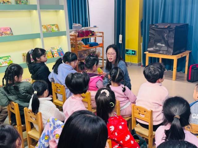 “在寒冷的天气里,白熊、羊驼和小猫走在回家路上,突然闻到一股香喷喷的味道——顺着香味找过去,竟发现一个巨大的南瓜!旁边木板上写着南瓜汤泡澡池,请随心所欲地泡澡,但千万别喝南瓜汤。”文化志愿者老师用温柔又富有感染力的声音,把故事中“好奇心与规则”的核心冲突缓缓铺开。