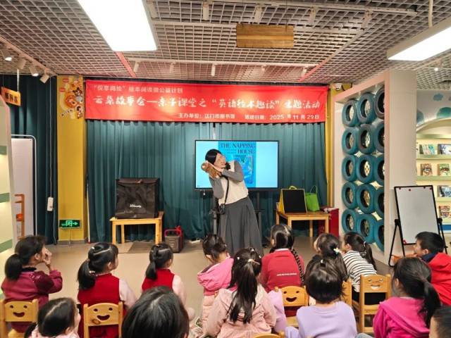 当欢快的歌声落下,志愿者老师缓缓打开了绘本《The Napping House》。一座在雨中静谧打盹的房子展现在大家面前,故事从一位打鼾的老奶奶开始,一场有趣的“睡眠叠加”之旅正式上演。