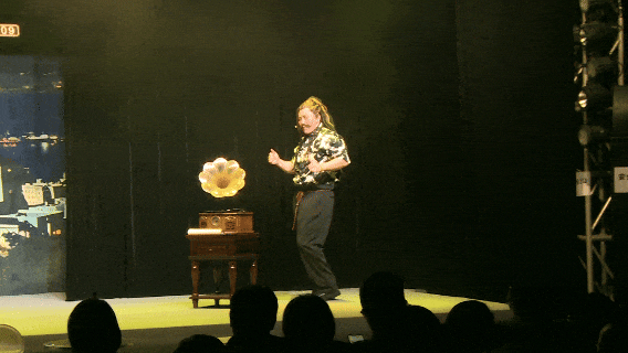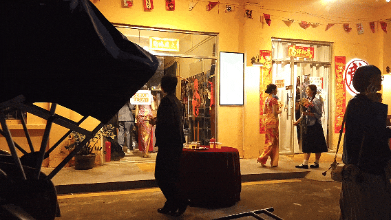 还没走进剧场,经过骑楼、老屋、巷道,你仿佛穿越时光隧道,走进四十年代的街区。踏进大院:你可见到热情的商贩、善良的卖花女、质朴的车夫……哦,还有过来跟你接头的特工,记得对上暗号,否则就拿不到船票了!靓女们当然要注意提防,角落里,竟然有……不剧透!走入1942的香港大中华酒店,在酒吧随着找个座位坐下,昏暗的灯光、老式留声机流淌出的《夜来香》、空气中若有似无的白玉兰花香气息……舞台边界被刻意模糊,特务从你身边匆匆走过,子弹上膛的声响,伴随“砰”的一声,那硝烟的气味,就在你的身边弥漫。