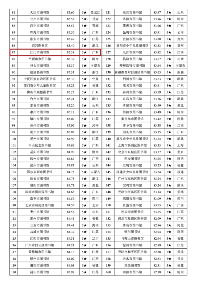 2025年12月29日,由武汉大学中国科学评价研究中心与数字出版智能服务技术教育部工程研究中心联合研发的《数智时代中国图书馆影响力指数报告(2025)》正式发布。江门市图书馆从全国1980家公共图书馆中脱颖而出,位列“中国公共图书馆影响力指数”排行榜第87名、广东地区第9名。