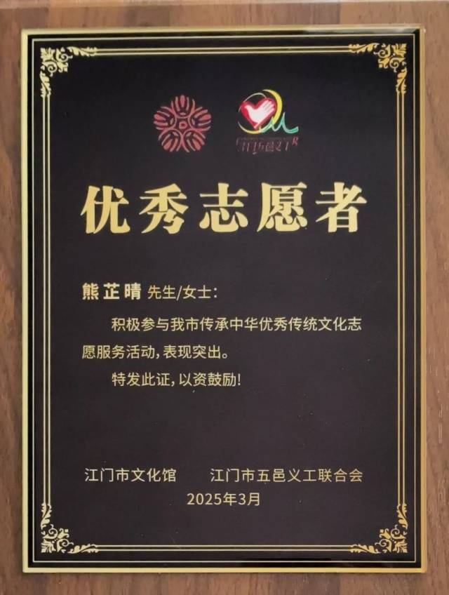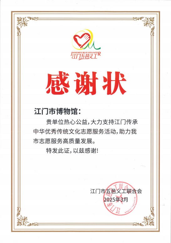 江博志愿者们身体力行传承中华优秀传统文化,助力江门市志愿服务高质量发展,获得由江门五邑义工联合会颁发的感谢状。