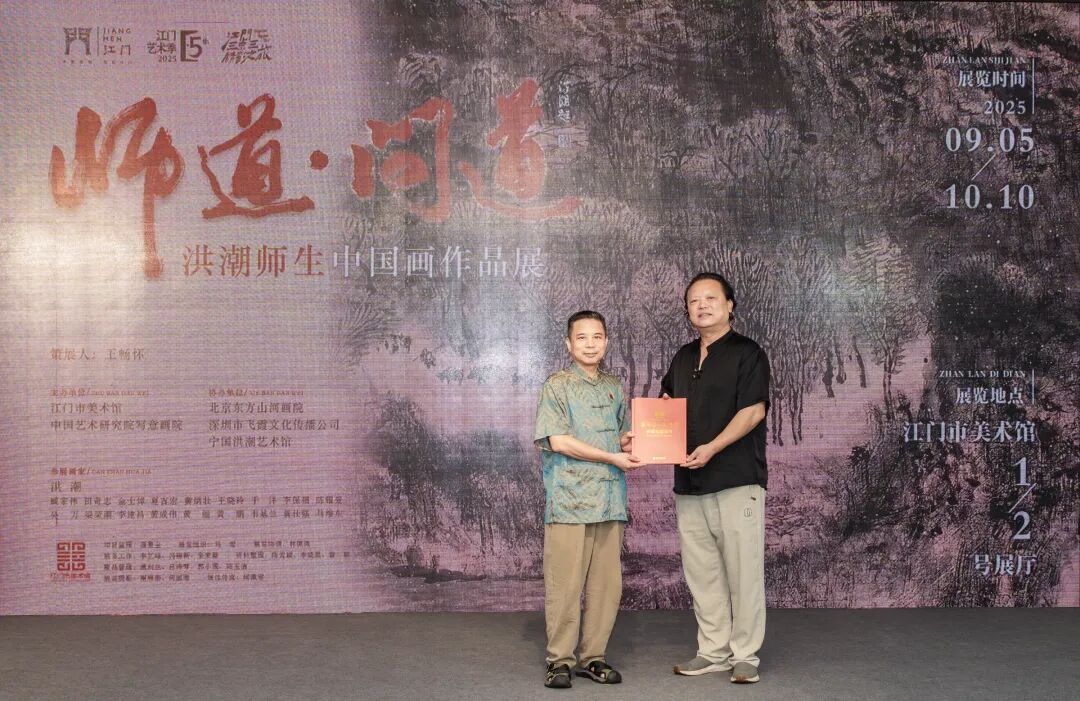 洪潮先生慷慨地将他的国画作品《心清无杂尘》、书法作品《师道问道》无偿捐赠给江门市美术馆永久收藏。江门市美术馆馆长王畅怀作为代表接受作品捐赠并向洪潮先生颁发收藏证书。
