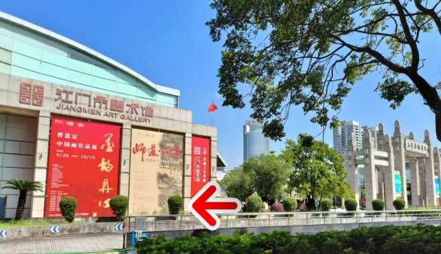 江门市美术馆-南门主入口位置参考:由江门市五邑华侨广场西门入口处右转前行约200米即可抵达,此处正对中天国际3期,与华侨广场公交站直线距离约100米。