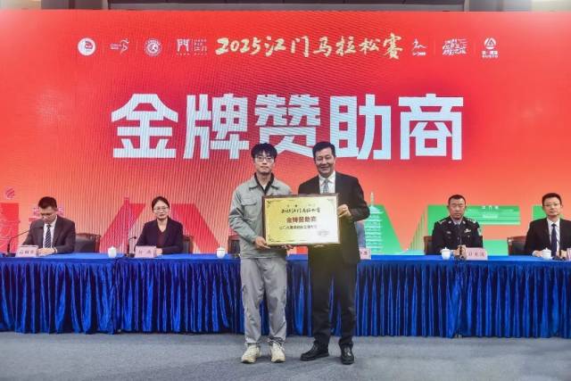 2025江门马拉松赛组委会16日召开新闻发布会,介绍江门马拉松赛的筹备情况,公布赛事线路、奖牌、参赛服,并举行赛事赞助商授牌仪式。副市长林健生出席会议。