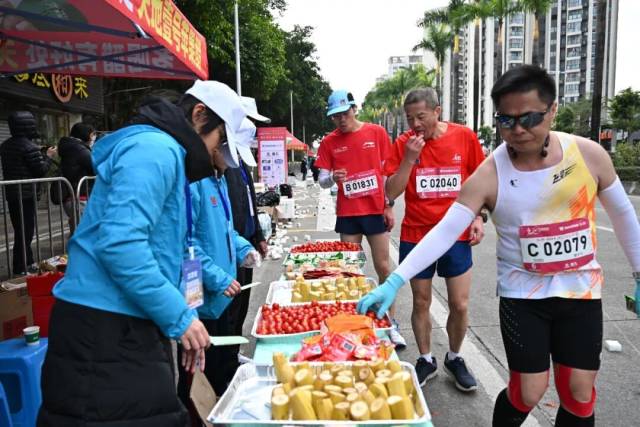 所有补给站均增加冰块供应,降温海绵站的海绵量提升30%。选手的人均饮用水和运动饮料配置标准增加20%。赛道沿途共设置8处喷淋降温点(1处喷淋装置、7处雾炮车),并在17.5、22.5、30、35公里处增设冰棍补给。同时,物资应急车将随时为各站补充饮水、饮料及医用冰袋。