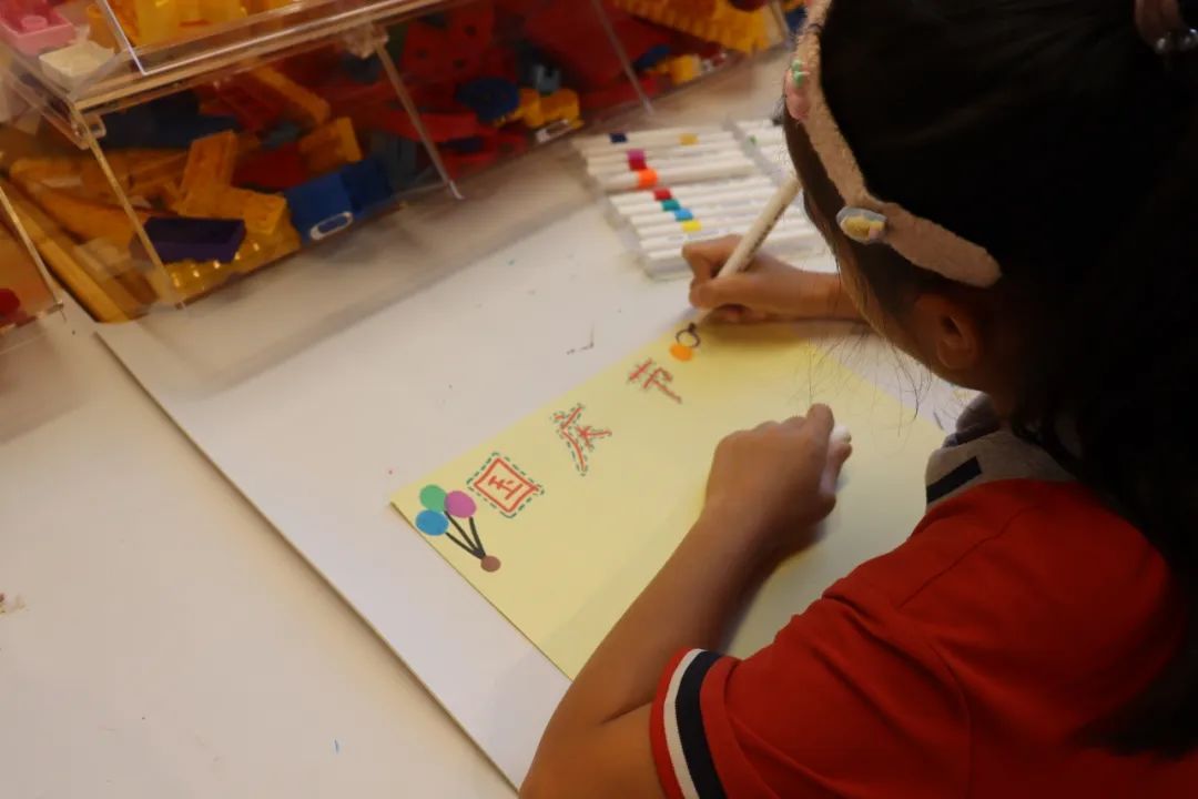 孩子们纷纷拿起手工制作材料,在祝福墙上粘下对祖国最诚挚的祝福。有质朴的“祖国妈妈生日快乐”、有深情的“祖国万岁”生日蛋糕、有直飞冲天的“中国航天火箭”等,每一幅佳作无不透露着孩子们纯真的爱国情怀和对祖国发展繁荣昌盛的感慨与自豪,饱含着对祖国母亲深深的热爱。