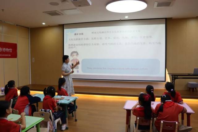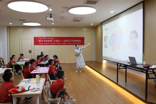 最后,为了让孩子们更好地了解五邑本土文化,活动设置了英文科普环节。江门职业技术学院英语教研室陈嘉恩老师用简单易懂的英文介绍了五邑地区的特色文化,如碉楼、陈皮、小鸟天堂、温泉等。孩子们积极参与互动,学习了一些与本土文化相关的英文词汇和表达。通过这个环节,孩子们不仅提高了英语水平,同时增强了对家乡文化的认同感和自豪感。