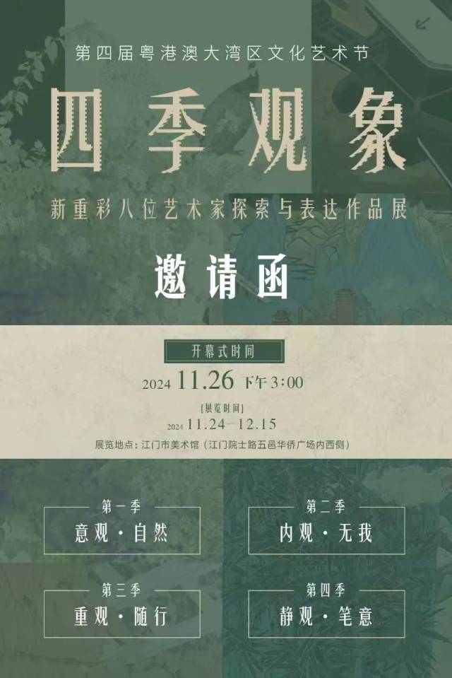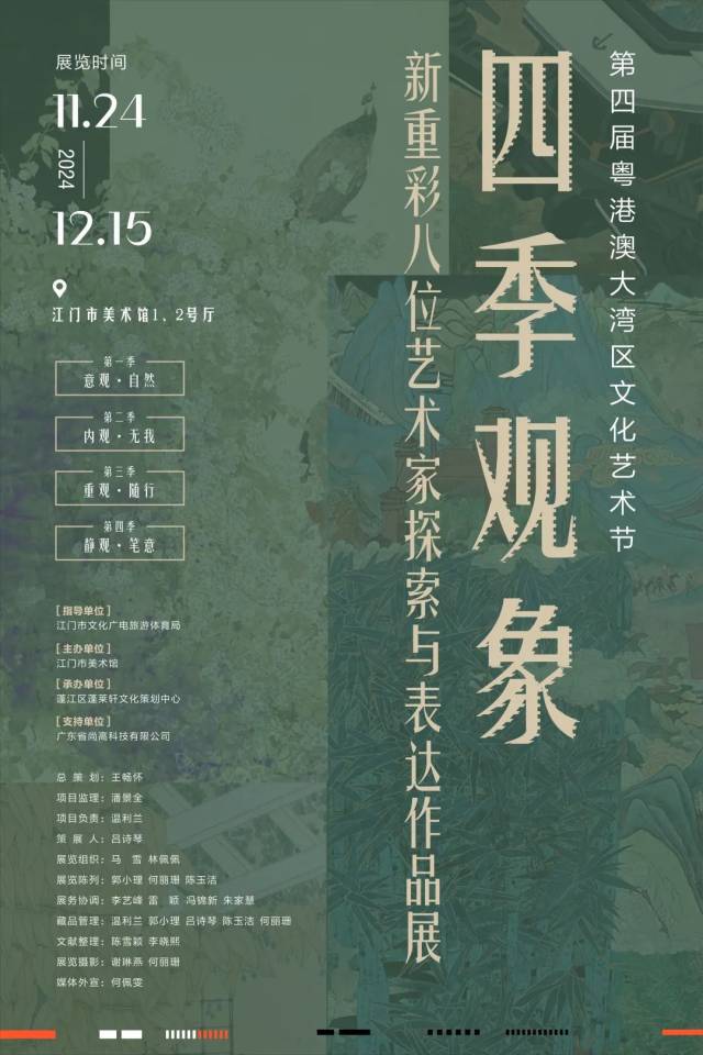 本次展览以“四季观象”为主题,邀请了“新生力”粤港澳中青年刘雨衢、林培聪、章小兰、郝畅、李莉、李亚娟、黄韵琳、余淑芳八位画风卓异的新重彩画家矩阵,通过极具探索精神的作品展示,表达多元化、多样性的艺术发展思路。展览分为“第一季:意观·自然”“第二季:内观·无我”“第三季:重观·随行”“第四季:静观·笔意”四个篇章。“四季”蕴含着艺术家不论寒暑交替,始终如一地坚守在创作之路上的勤奋与坚持。通过“四季”的归纳总结,既是对时间的深入探讨,也是在重新调整“观的方式”,进而展现艺术家对自然、生命和艺术的感悟。其中有以色彩变法为主的新探索,也有以造型为突破口的新尝试,更有在材质和形式上别具匠心的新突破。展出作品不仅在技法上展现了新重彩画的独特魅力,更在主题和表达上呈现出多元的风格和创新的思维,是“新生力”画家的一次尝试性表达。