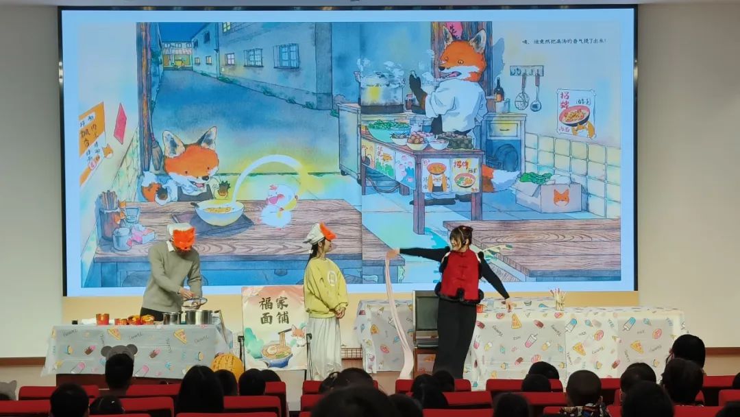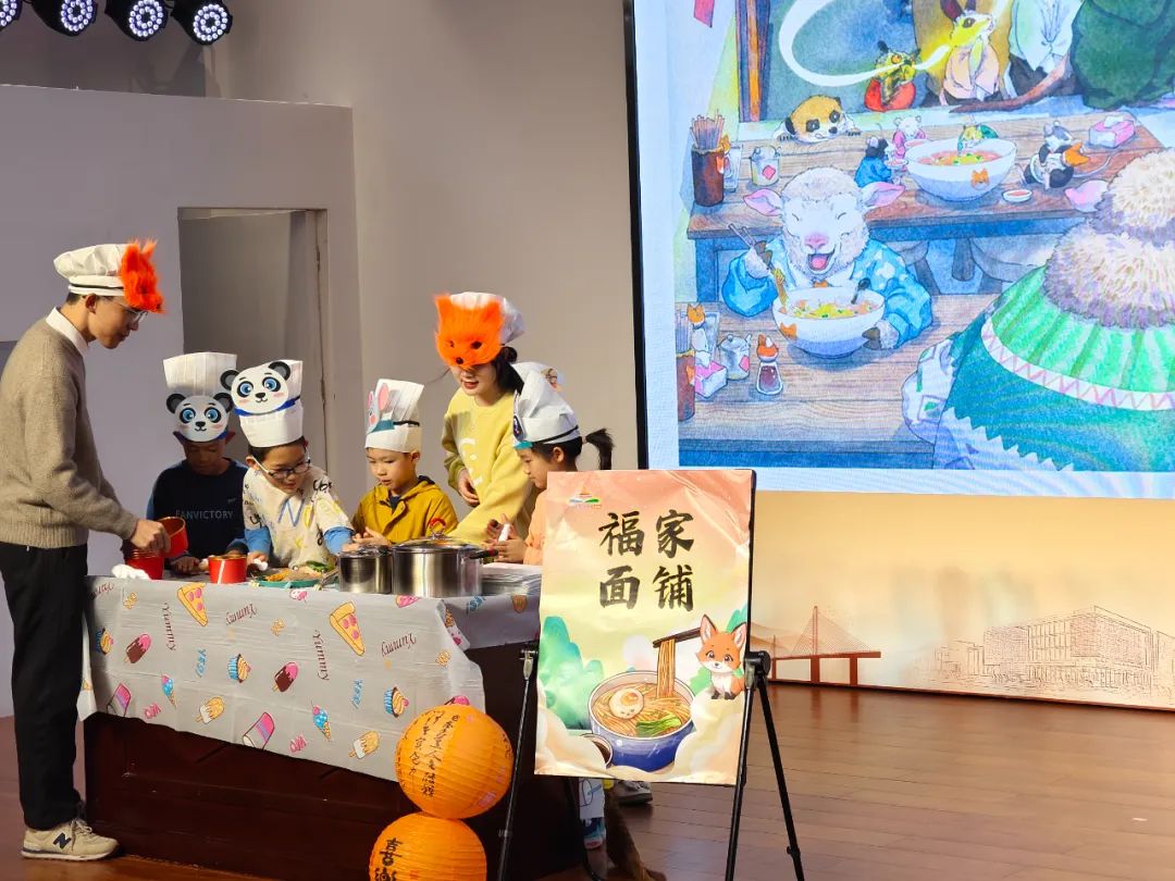 舞台上,演员们凭借精彩的表演和丰富多样的道具,将绘本中的世界栩栩如生地呈现在观众眼前。那憨态可掬、宛如娃娃的“小福气”,萌系十足、橘黄面庞搭配暖黄色大耳朵且手端面碗的小狐狸,以及灯笼、福字贴纸等节日元素,无不让人仿佛置身于绘本的奇妙情境之中。
