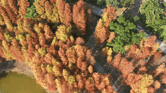 成片的杉树的树叶逐渐由绿转黄再转红,